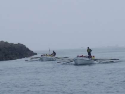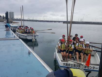 いよいよ、最初のマリンプログラム、カッター体験です。おそるおそる乗り込み、協力してオールをこいでいます。