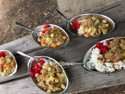 自分たちで作ったカレー。あちこちで「おいしい!」という声がします。今から使った道具をピカピカにします。