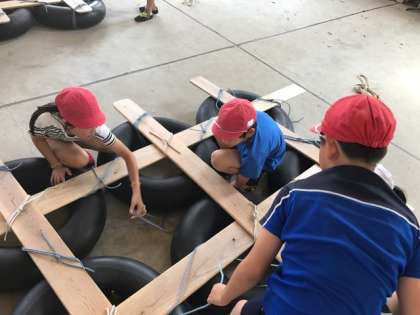 タイヤと大きな板を運んで、ロープで結びました。結び方を互いに教えあいながら、いかだを完成させました。