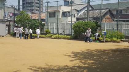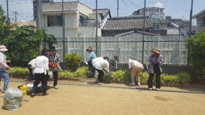 西運動場のはしにあるゲートボール場。そのまわりには、きれいにととのえられた、花壇が。その理由は、定期的に阿倍野女性会の方々がお手入れをしてくださっているからです。今日も、暑い中大勢の方々がお手入れをしてくださいました。おかげでたくさんの草花も、喜んでいるようです。いつもありがとうございます。そして、これからもよろしくお願いします。