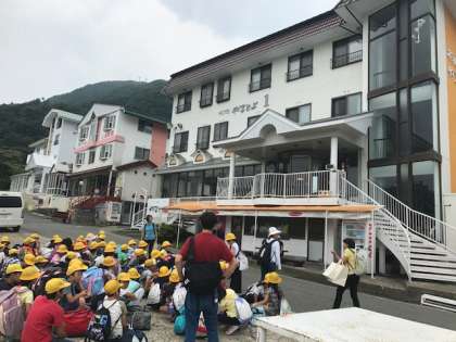 少々天気が心配ですが、無事宿舎に到着しました。5年生のみんなはドキドキワクワクしています。