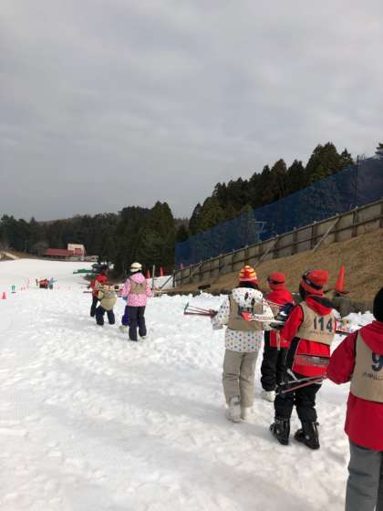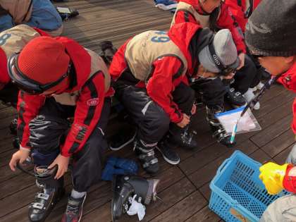 初めて履く、ブーツ。板とストックを持って歩くのも難しそう。でも、みんなの顔は、笑顔です。