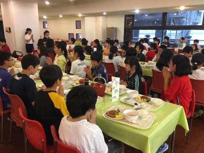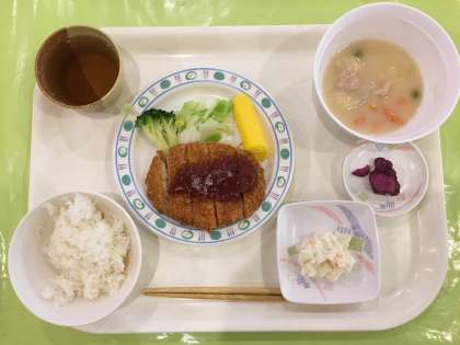 1日目の夕食はチキンカツとクリームシチューです。たくさん活動をしたので、お腹はぺこぺこです!しっかり食べて、明日に備えます。