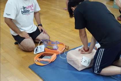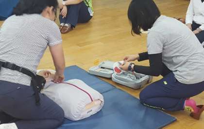 阿倍野小学校では学校生活での緊急事案に対応するため、様々な避難訓練や教員研修を実施しています。今日は、阿倍野消防署の方々に来ていただき、教職員がAEDの操作や心臓マッサージの仕方について講習を行いました。