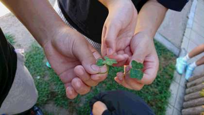 班長を中心に、班行動をします。班のメンバー全員でトイレへ。友達を待っている間に、四つ葉のクローバーを2つも見つけました!宿舎まであと1時間ほど。なんだかステキなことが起きそうです。