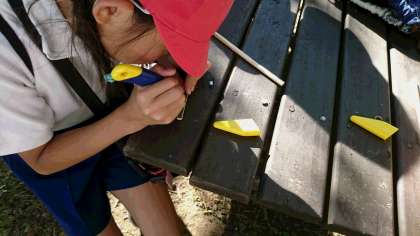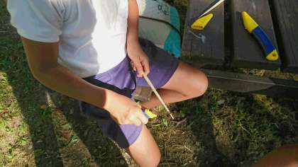 竹がだんだん細くなってきました。完成した子は、緑の部分に自分のイニシャルやマークを彫っています。