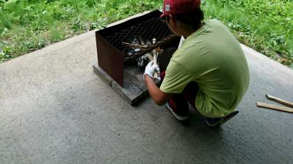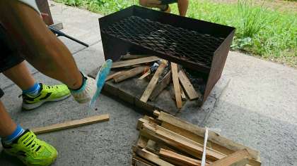 火起こしは、なかなか難しいです。薪を組み立てて、様子を見てあおぐ。ただ、煙が目にしみるー!