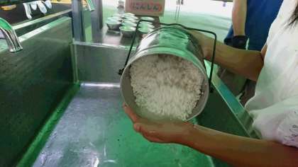 お米を洗っています。「水は白くにごってていいねんな?」お米のうまみをきちんと残しています。