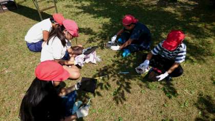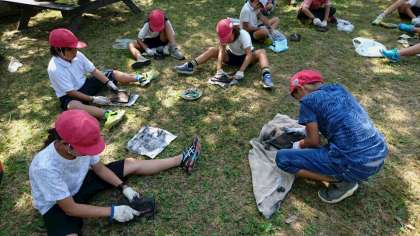 班みんなで輪になってゴシゴシ・ゴシゴシ。だんだん光沢のある茶色になってきました。
