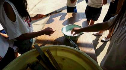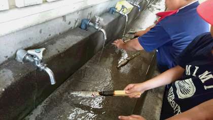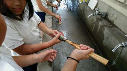 自分で魚に串をさして、塩をふります。大事な「命」の学習です。
