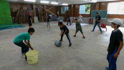 できるだけ速く何回も、コロコロ転がします。班で縦一列に並んで「いくで。」「せーの。」の大合唱です。
