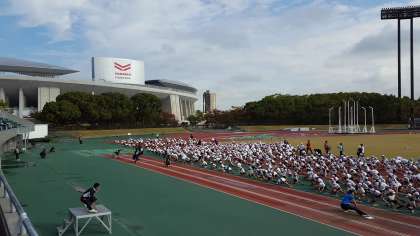 阿倍野区スポーツ交歓会で長居陸上競技場・長居第二陸上競技場に来ています。サッカー、ドッジボール、長なわに取り組みます。