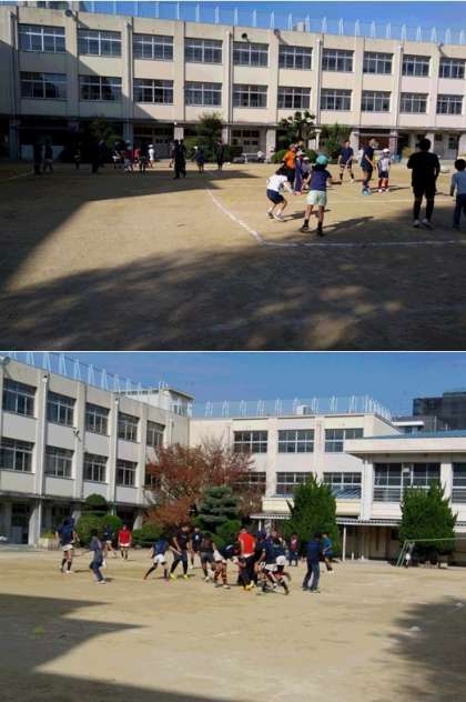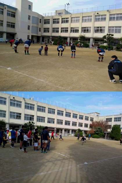 「やってみよ〜ラグビー体験会」がありました。40名を超える子どもたちが参加し汗を流しました。ラグビーボールを使ったビンゴやドッジボールで楽しみながら、ラグビーに親しみました。体験会の中では、中学生の実際のプレーを見て、そのかっこよさに引き込まれました。