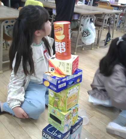 算数科「かたちあそび」の学習をしました。持ってきた箱を使って班ごとに、タワーや動物や建物など、様々なものを作りました。その活動の中で、積むことができる形や転がる形などに分けることができることに気づくことができました。各ご家庭で箱を集めていただき、ありがとうございました。