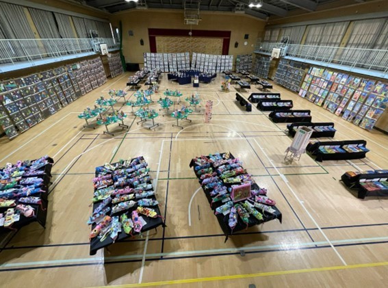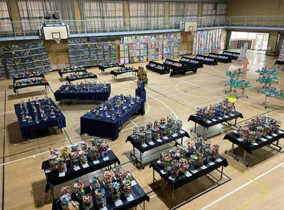 思いを込めて描いた絵や工作を講堂に展示しました。なかには、保護者の方と一緒に作品展に来て、「ここを作るのが難しかったよ」「友だちのこの作品すごいね!」など、説明したり感想を伝え合ったりしながら作品展を楽しむ姿も見られました。