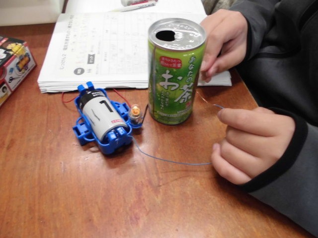 理科「電気で明かりをつけよう」では、豆電球とかん電池をどう線でつないで明かりをつける実験やどんなものが電気を通すのかを調べる実験をしました。「10円玉は明かりがついた。」や「空きかんは色をけずると明かりがついたよ。」など、電気が通るのか色々なものを夢中で調べていました。