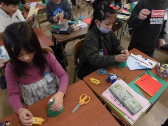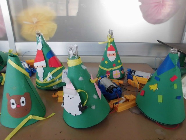 学習後は、豆電球とシーソースイッチを使ってクリスマスツリーを作りました。サンタクロースやリボン、理科の実験道具など思い思いのかざりを作り、オリジナルクリスマスツリーが完成しました。お家でもぜひ、かざってみてください。