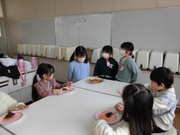 先週、2年生が大根パーティーに招待してくれました。作ってもらった大根餅を食べたり、クイズに参加したりするなど、とても楽しい時間を過ごすことができました。今週はおもちゃランドがあり、2年生と交流する行事が続きます。2年生のお兄さん、お姉さんとたくさんお話できたらと思っています。