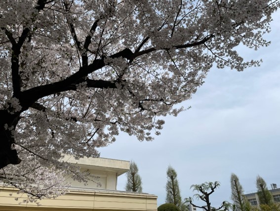 明日の入学式を待ちわびているかのように、講堂前の桜の花が今まさに満開を迎えています。