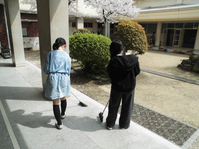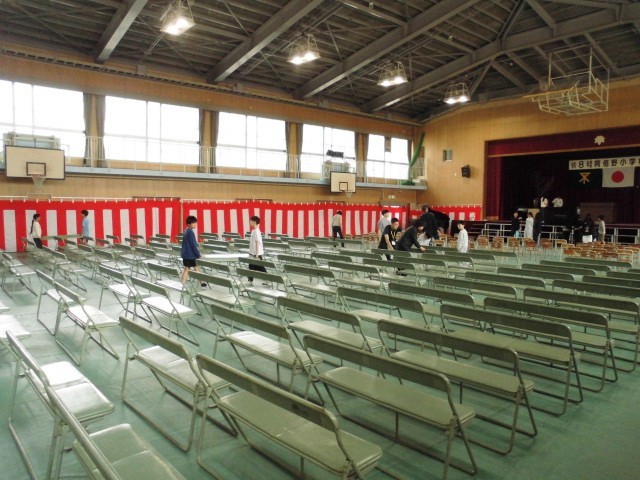 今日は新6年生が登校して、講堂や教室の準備や校舎内の清掃をがんばってくれました。また、新2年生は、明日式で披露するお祝いの演技の練習をしました。