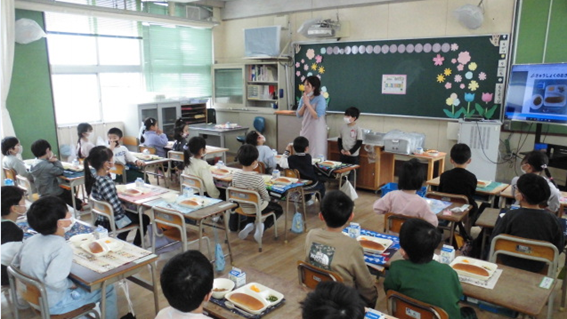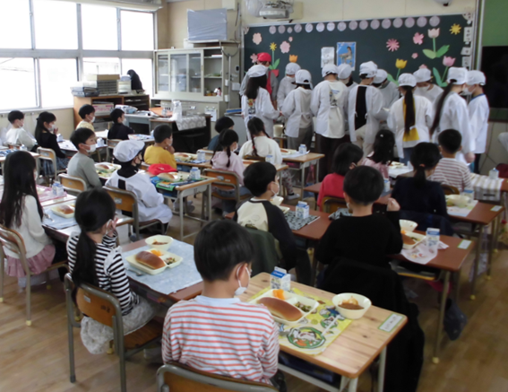 1年生の子ども達は、「小学校の給食おいしい!」「おかわりしたい!」「6年生や給食の先生にありがとうが言いたい!」と話しながら、とても楽しそうに食べていました。