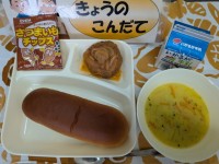 煮込みハンバーグ、コーンスープ、おさつチップス、黒糖パン、牛乳