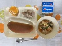 今日の給食は鶏肉とほうれんほうのシチュー、キャベツとコーンのサラダ、デコポン、黒...