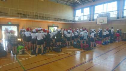 出発式では、「進んで行動することをめあてにがんばります」と係の子ども達が、挨拶をしました。