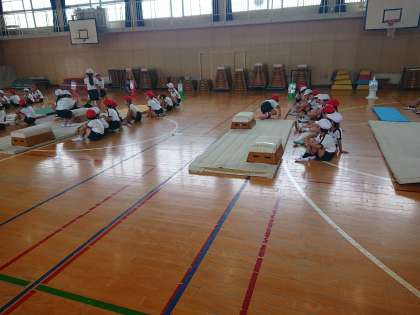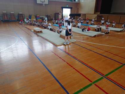 子どもたちは、「ころころ坂道コース」「でこぼこコース」「ぴょんぴょんコース」から一つ選び、いろいろな動きを組み合わせたものを発表しました。自分で考えた動きには、オリジナルの名前をつけています。「ぼくは、足ぬけうさぎをします。」「わたしは、くまころりんをします。」など、自分のオリジナルの発表をした子どもたちは、満足そうな顔をしていました。