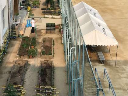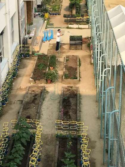 児童のみなさんが帰った放課後、花壇の辺りに人影が・・・