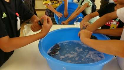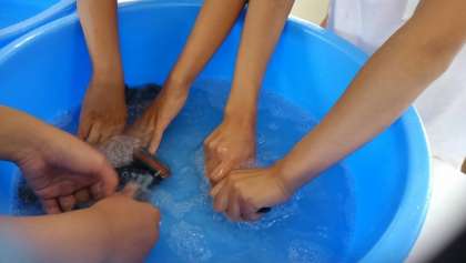 はじめは水だけで洗い、そのあと洗剤を入れてゴシゴシ。