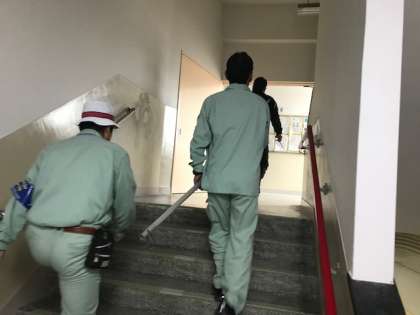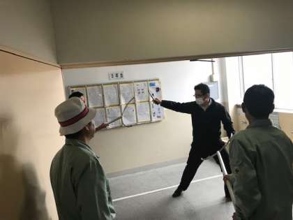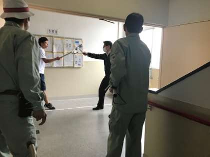 まずは、不審者を逃がさずに『さすまた』を持って追い込んでいきます。