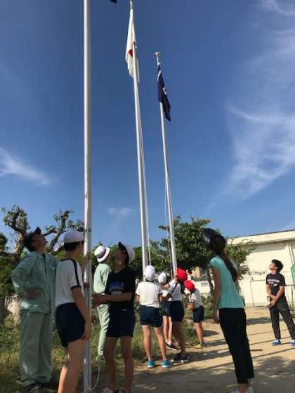 担当の子ども達が、曲に合わせて旗を降ろすところです。