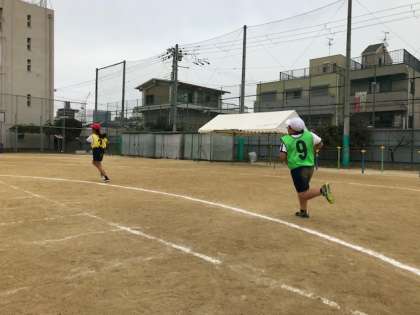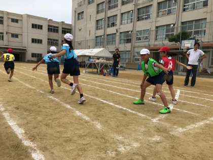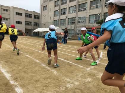 5年生が運動場でリレーの練習をしていました。