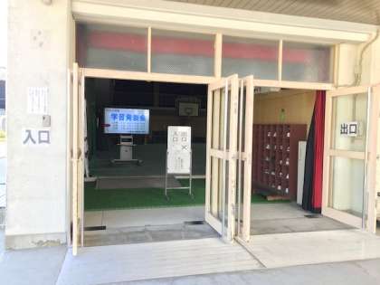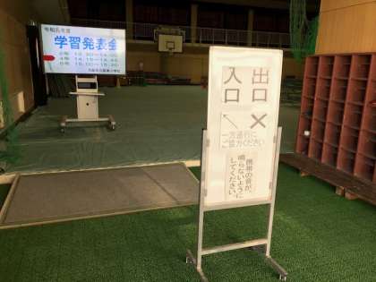 講堂入り口に案内板を設置して一方通行にいたしました。
