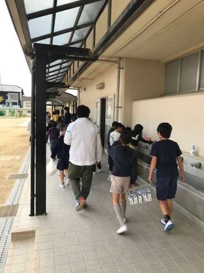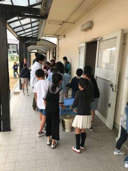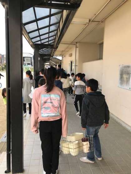 子ども達は給食を食べた後、このように給食当番の子ども達が食管を返却しています。