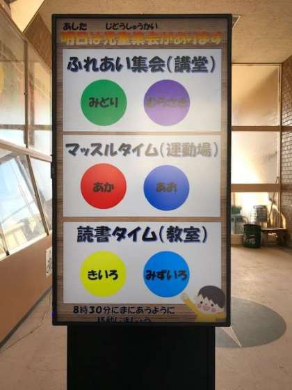 朝、登校してきた子ども達は、自分の集会の場所を確認して移動します。