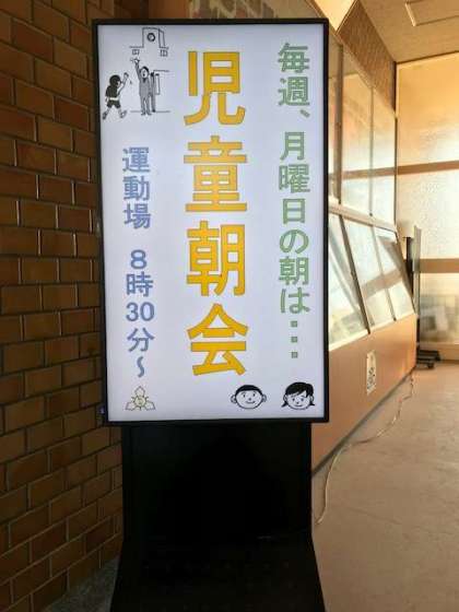 まずは、デジタルサイネージで「今日、児童朝会あるよ!」と子ども達に伝えています。