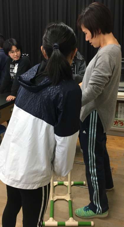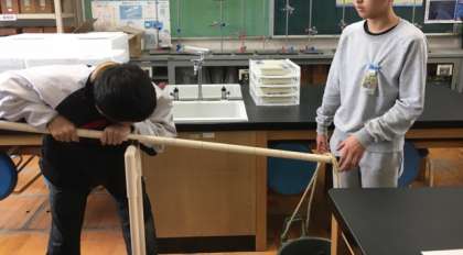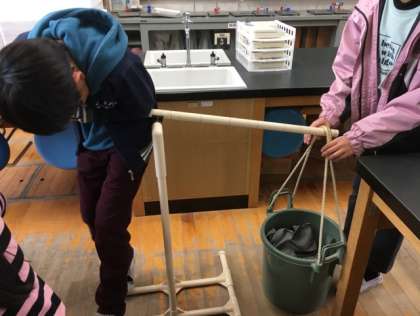 てこをどう使えば、重いものを小さな力で持ち上げることができるのかの実験を行いました。