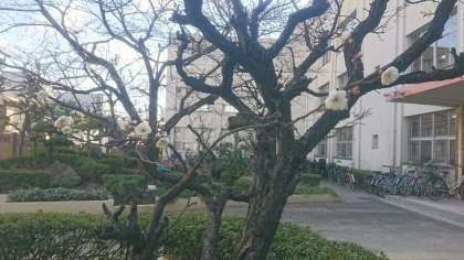 その、梅の木に白い梅の花がぽつぽつと咲き始めました。