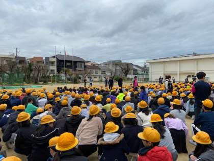 避難後、担当の先生のお話、校長先生のお話を聞いています。