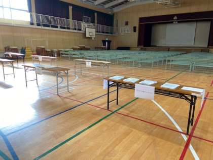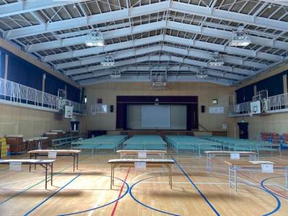 また、開始時刻までのお待ちいただいている間に、大型プロジェクター及び大型スクリーンを使って、学校紹介の映像を流しておりました。