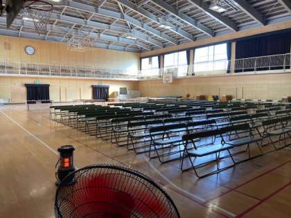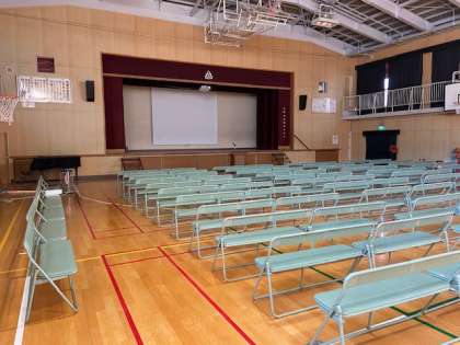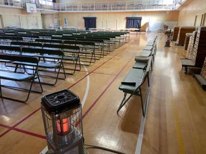 講堂の寒さ対策として、お昼からストーブをつけて温めておりました。