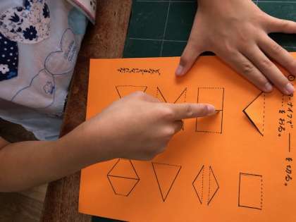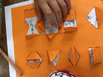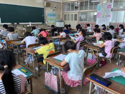 2年生の図工では、カッターナイフで紙を切る練習をしています。