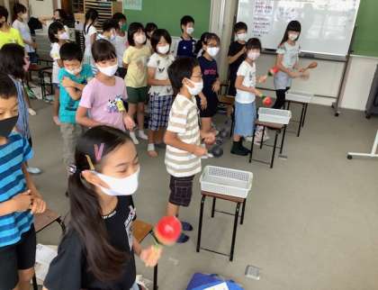 リズム譜をみながらしっかり拍を取ろうとする子、「タンゥタウンタン・・・」と口ずさみながら曲に乗っている子、体全体で拍をとり膝を折ったり、腰を振ったりしながらリズムにノリノリで演奏する子。