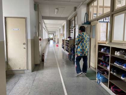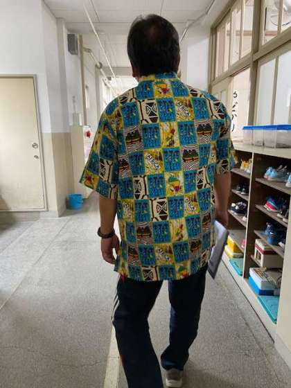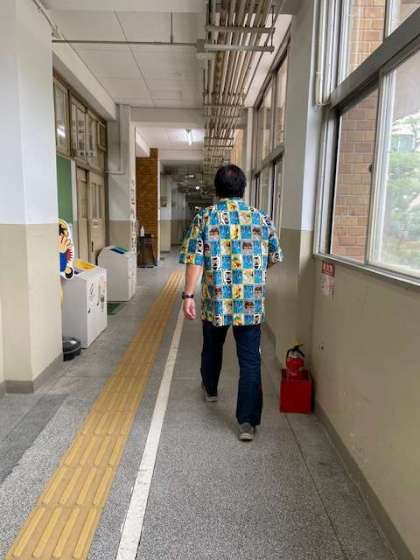 民族衣装を着た〇〇先生が、職員室を出てどこかに向かってます。