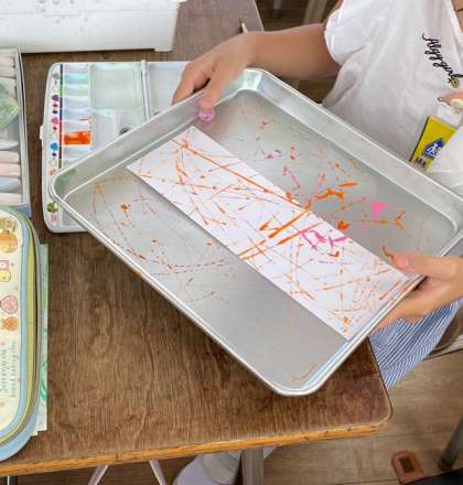 マーブリングやスパッタリング、ビー玉に絵の具をつけてコロコロ転がしたりと試すたびに歓声が上がりました。