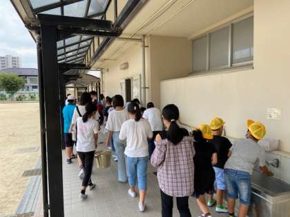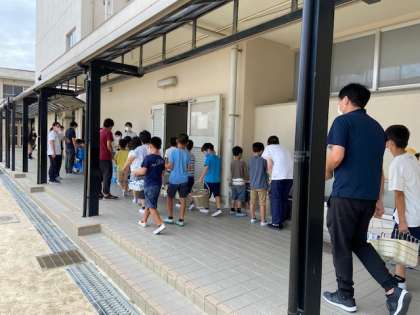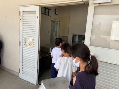 このように、子どもたちは給食室に並んで食器を返しに行っています。