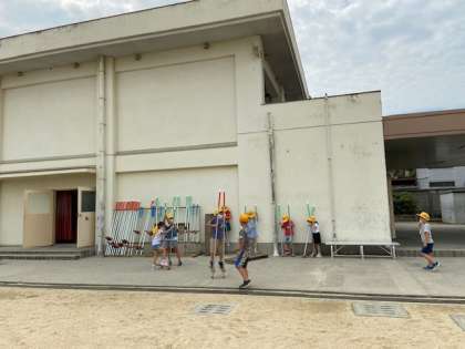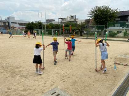 低学年の子どもたちが「竹馬」にチャレンジしていました。