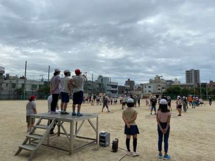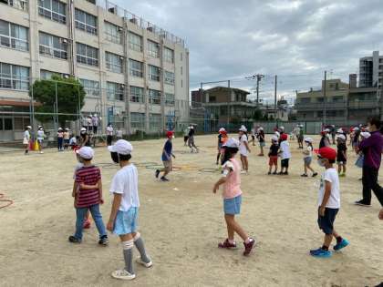 運動場でなかよし班活動「マッスルタイム」が行われていました。